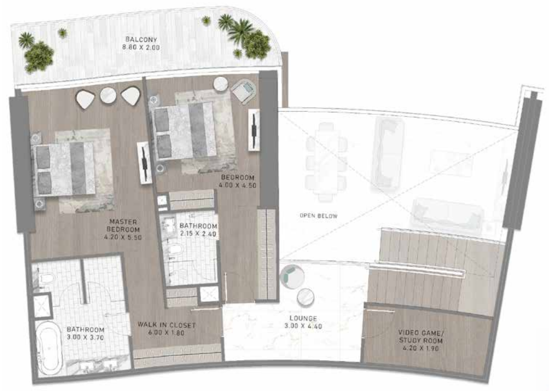 Комплекс предлагает роскошные апартаменты с 1, 2 и 3 спальнями, а также супер-роскошные дуплексы с 3, 4 и 5 спальнями.
